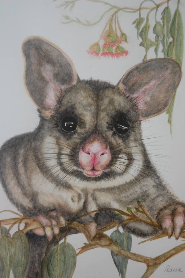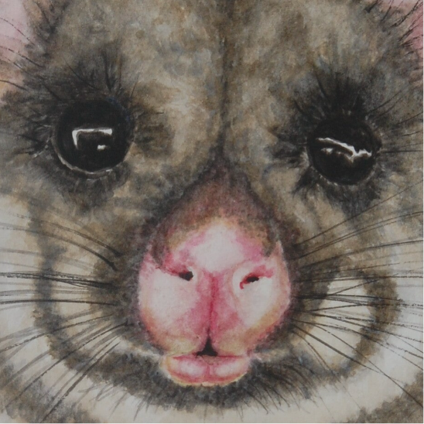 With its curious gaze and bright pink nose, this little possum peeks out from the branches, full of charm and mischief. a celebration of Australia's nocturnal beauty, painted with softness and detail that brings its personality to life.